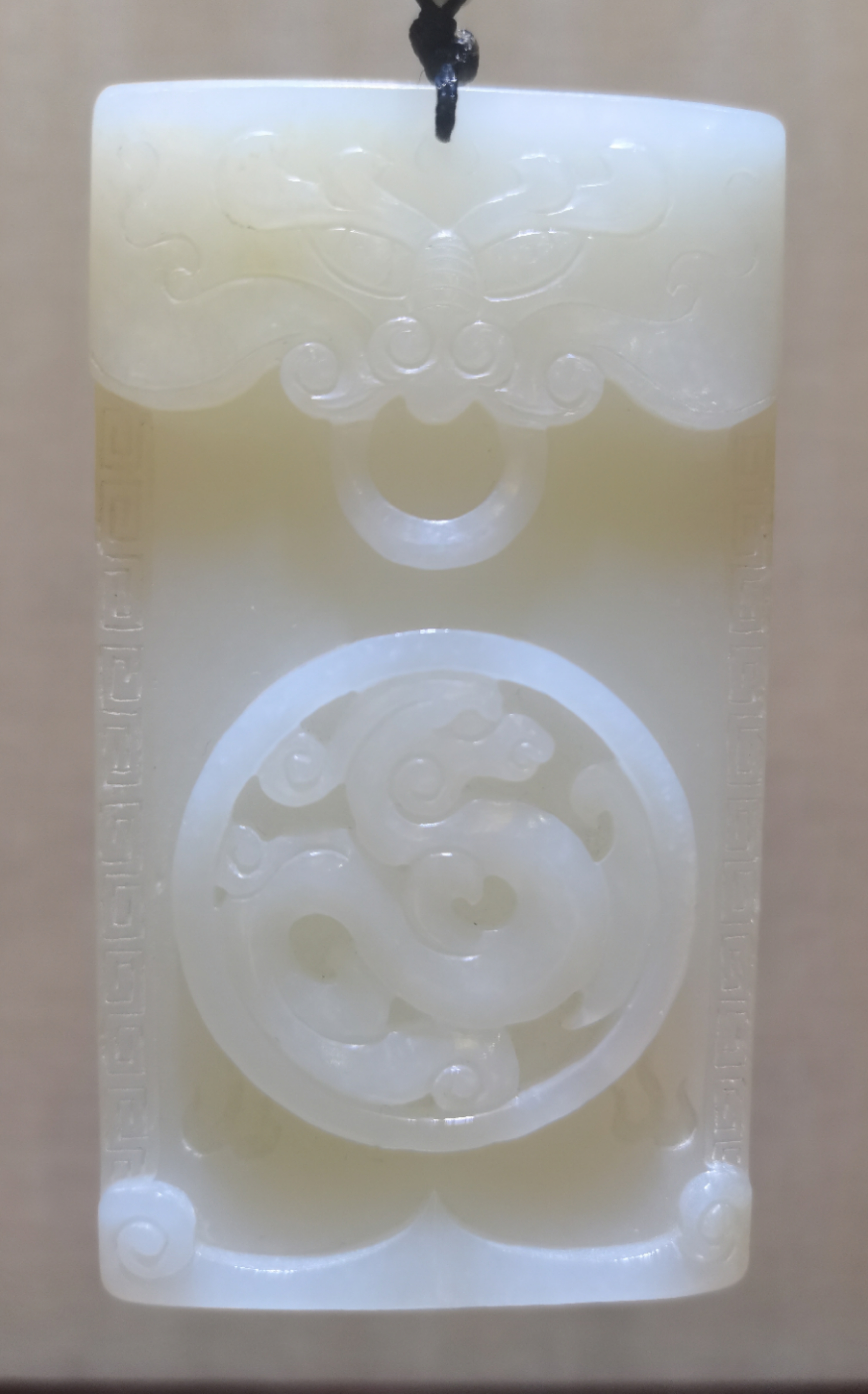 此款玉牌牌型方正,以椒圖鼻梁為中線,兩側紋飾作對稱排列,椒圖怒目而視,露齒銜環,莊重威嚴。下刻飛龍圖騰,闡釋了椒圖為龍之九子的傳說。兩側飾以回形紋,寓意吉祥如意,其后又呼應以半壁形的乳釘紋。整塊玉牌如一扇莊重氣派的大門,透露著威嚴、權勢和貴氣。