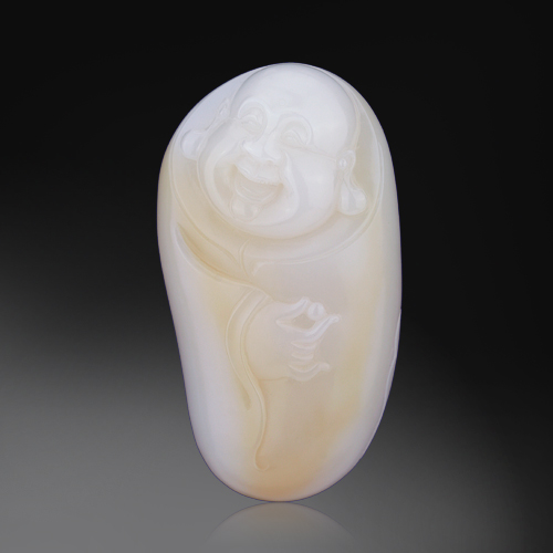 作品整體造型完整大氣,精心雕琢一位笑意迷人的彌勒佛,笑佛開臉細致生動,光頭禿頂,彎眉笑眼,長耳垂肩,鼻頭高挺,玉佛笑意盈盈,和藹可親,手中托著一顆晶瑩的佛珠,淡淡的糖色遍布全身,更顯吉慶喜人!