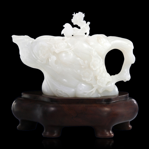 梅花樹樁線條疏朗滄桑,內壁挖空做壺身;枝干虬曲,旁逸斜出做壺柄;梅花或含苞待放,或傲然怒放,清婉嬌羞,香新四逸,一只喜鵲聞香而落,飛上枝頭。構圖嚴謹,畫面活躍,幽雅嫻靜。