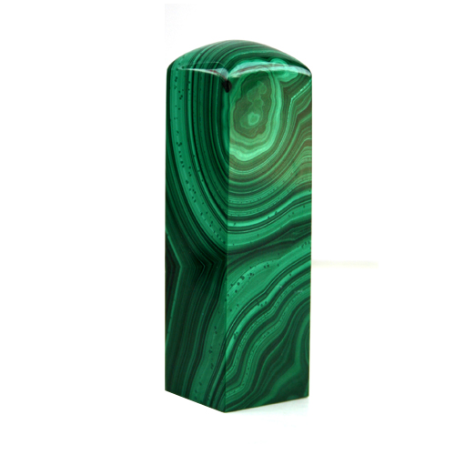 打磨成的印章,自然清新,味意雋永,間或柳葉彎眉,又似清晨露滴。氣質(zhì)獨特,高貴典雅,為印章藝術(shù)的奇葩;天生麗質(zhì),精美絕倫,色彩艷麗,紋理細(xì)膩,屬孔雀石上品,可謂“印章皇后”。孔雀石的英文名稱為Malachite,來自希臘語Mallache,指一種叫錦葵(Mallows)的植物,意思是“綠色”,以象征孔雀石的顏色。孔雀石由于顏色酷似孔雀羽毛上綠色的斑點而獲得如此美麗的名字。