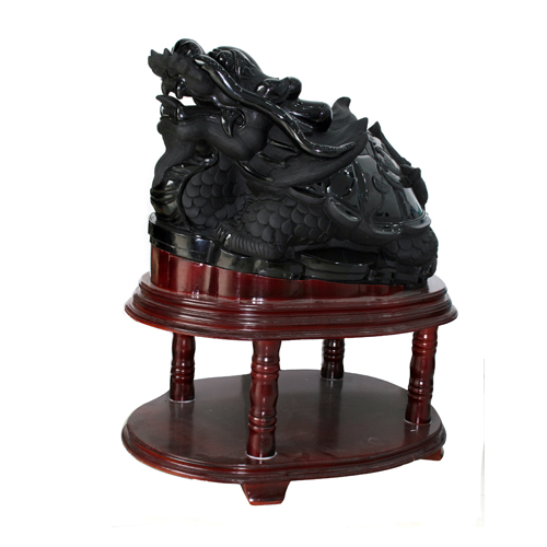 本件作品由整塊天然黑曜石精工雕琢而成,體態(tài)完美,威武大氣。以吉祥四靈之一的龍龜為題材,龍龜是瑞獸一種,形態(tài)為龍頭、龜背、麒麟尾,主吉祥招財(cái),化三煞。龍龜放在財(cái)位可催財(cái),放在三煞位或水氣較重之地最有效,風(fēng)水學(xué)有云:“要快發(fā),斗三煞”。水氣重之風(fēng)水位主是非口舌,龍龜在位能化口舌兼加強(qiáng)人緣。黑曜石是一種火山熔巖,人們相信黑曜石極度辟邪,能強(qiáng)力化解負(fù)能量。中國(guó)古代的佛教文物中,就有相當(dāng)多有關(guān)于鎮(zhèn)宅或避邪的黑曜石圣物或佛像。