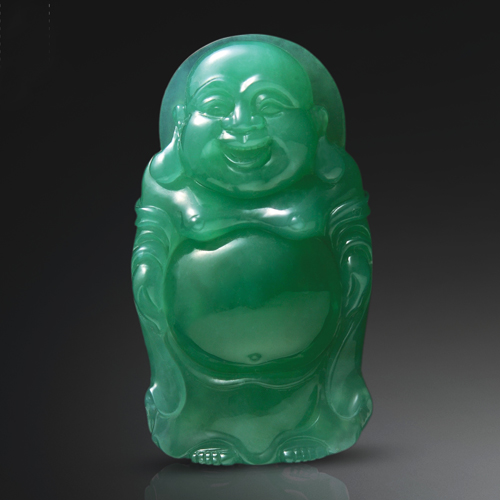 笑臉立佛,滿綠冰潤(rùn),腹部渾圓飽滿,熒光內(nèi)蘊(yùn)。