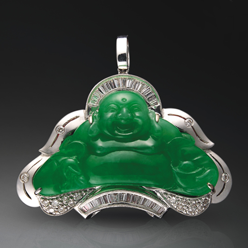 滿(mǎn)翠綠色,色澤均勻濃艷,細(xì)膩冰潤(rùn),配以奢華鑲鉆。